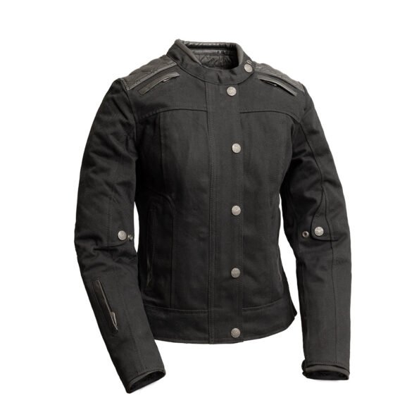 Diamond Back – Women’s Motorcycle Jacket with mixed materials This women’s moto jacket combines comfort and show stopping details. The main body is crafted from durable twill with diamond-stitched leather accents. The jacket features a tailored fit that contours to the body. The diamond-stitched leather detailing on th