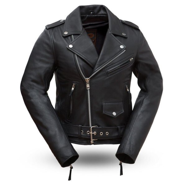 Jewel Women’s Motorcycle Leather Jacket in Black. Simple yet detailed, with full-length zipper, snap collar, and multiple pockets. Perfect for any ride!