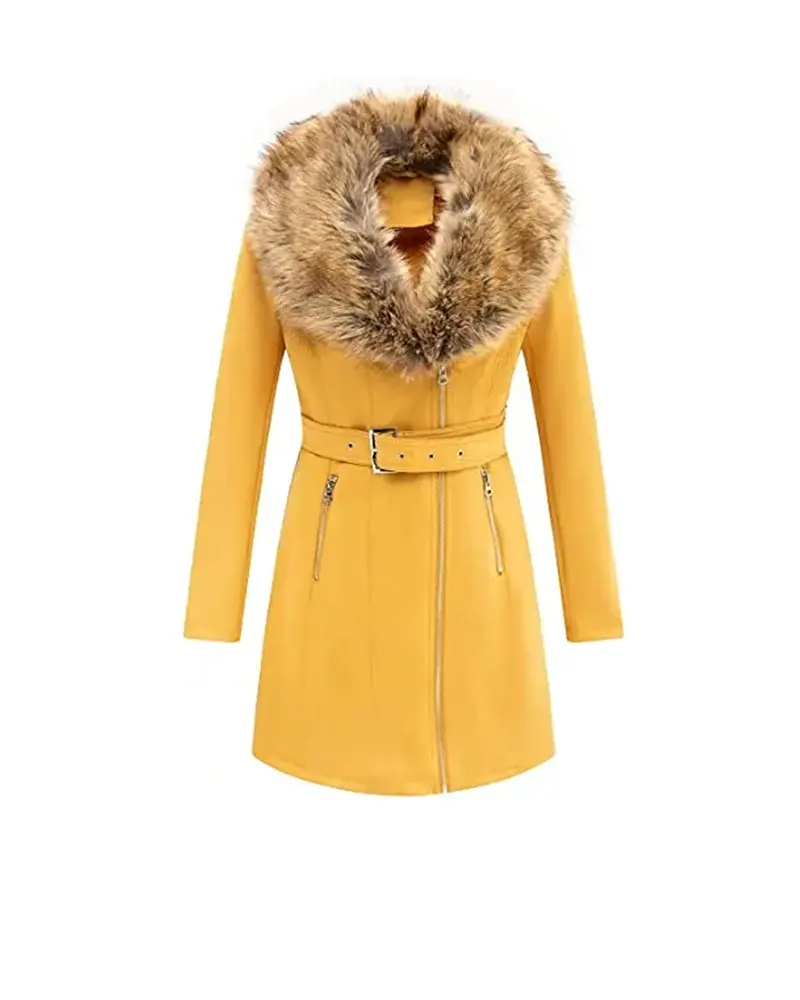 However, the Yellow Leather Fur Pea Coat has pretty decent features such as a front belt over zipper closure and a shearling fur collar along with two waist zipper pockets to store your small valuables such as mobile phones, small wallets, etc. Moreover, the coat’s yellow color will surely turn the heads of the guests at any event you walk in.